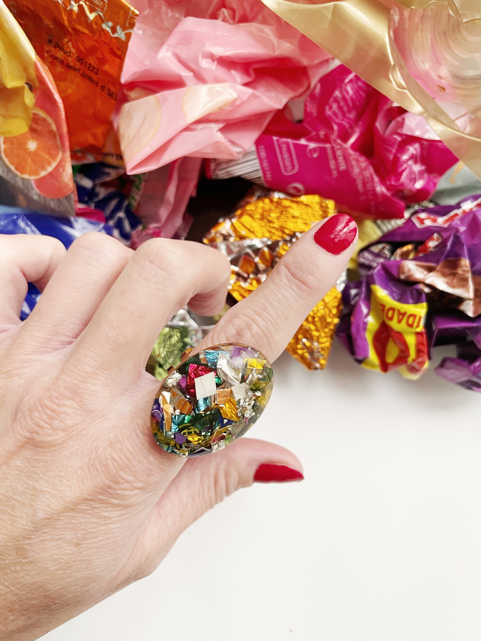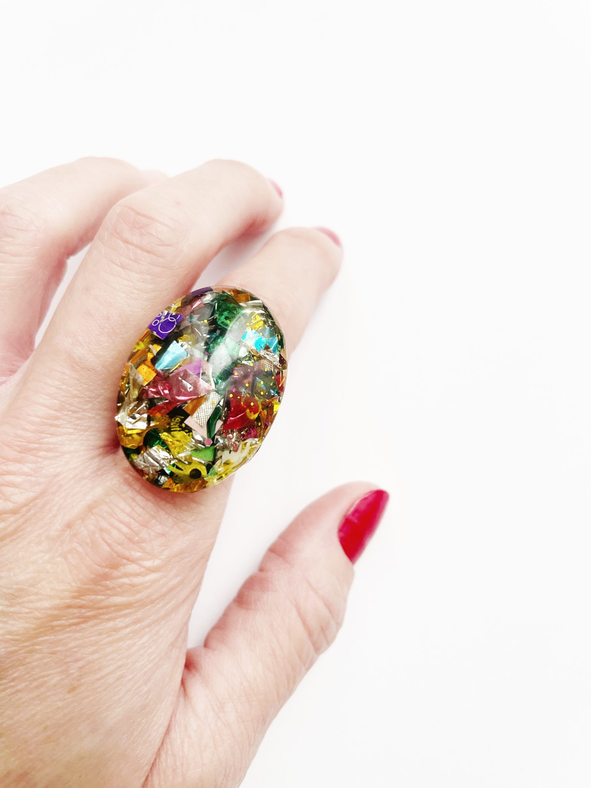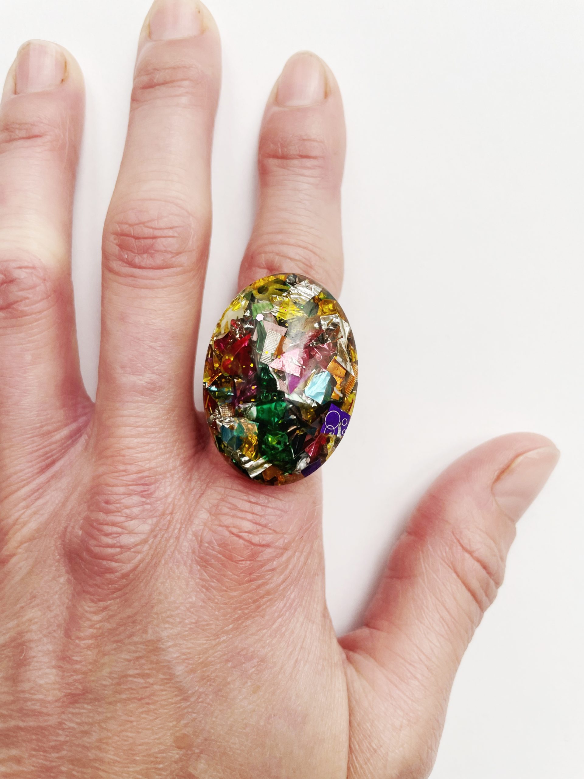 Toda la Colección Glastic está elaborada con envases y paquetes que desechamos diariamente y esta pieza no podía ser menos. Se trata de un anillo dorado con forma ovalada, de acero inoxidable, decorado con trozos pequeños de plástico clasificado, cortado, organizado y sellado con resina epoxi. Y sí, como lees, BASURA o como más me gusta decir, hecho con materiales RECICLADOS.