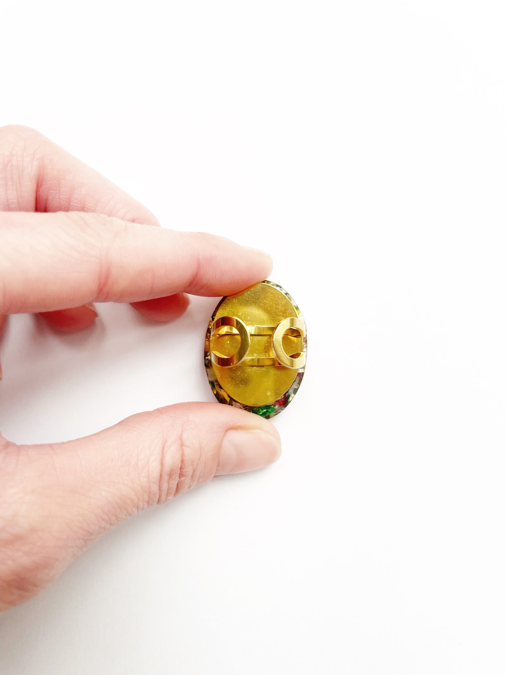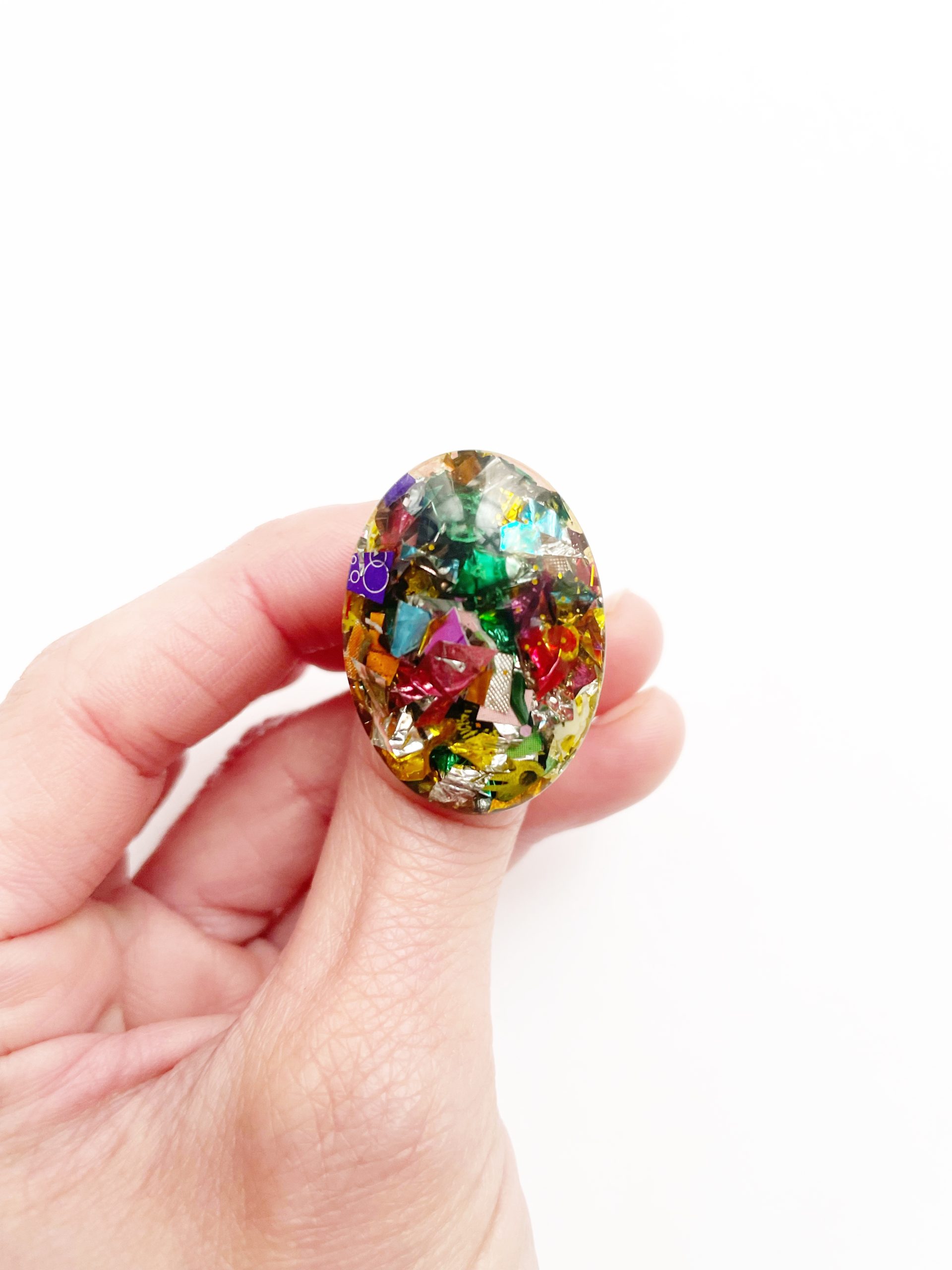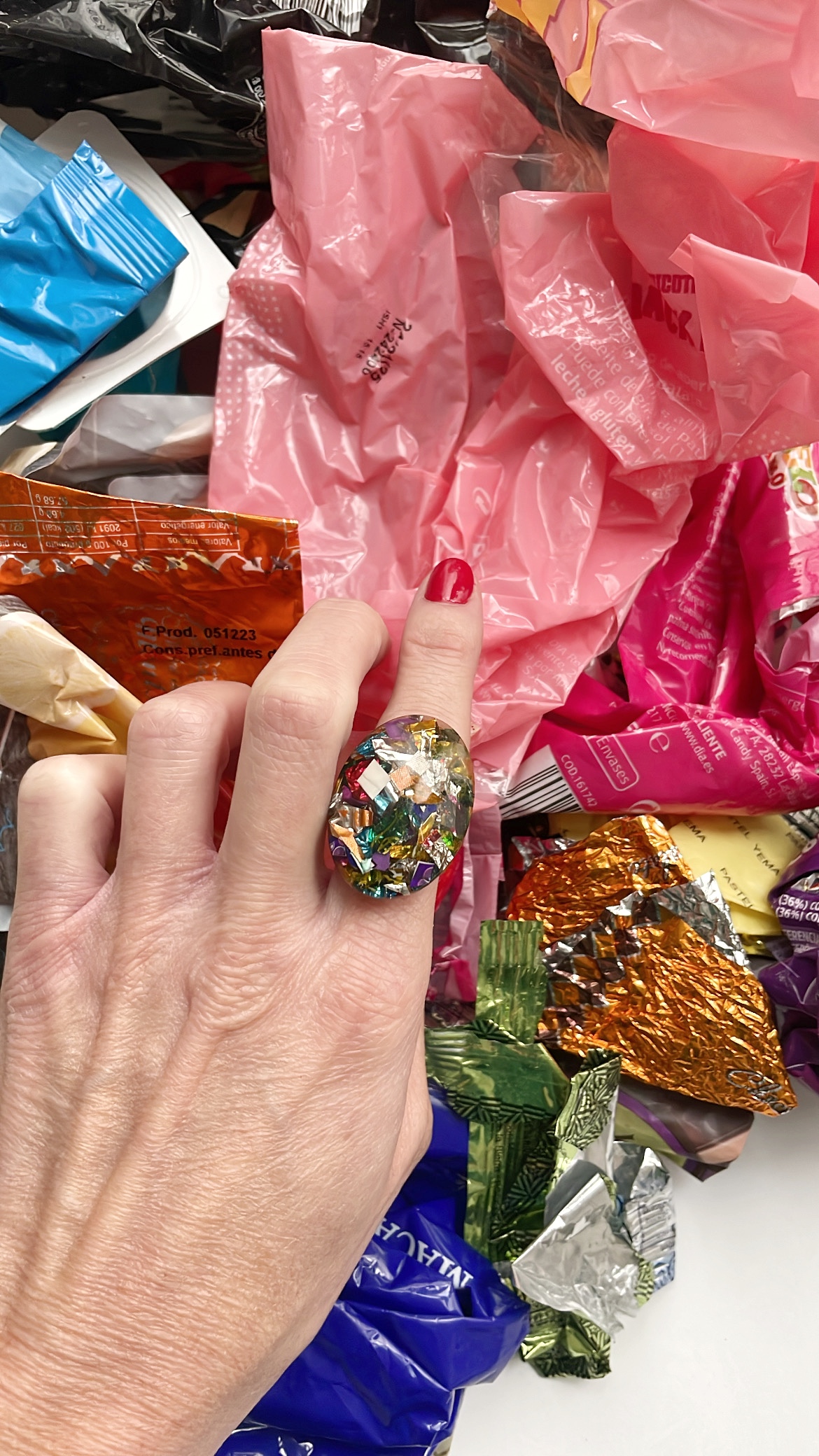 Toda la Colección Glastic está elaborada con envases y paquetes que desechamos diariamente y esta pieza no podía ser menos. Se trata de un anillo dorado con forma ovalada, de acero inoxidable, decorado con trozos pequeños de plástico clasificado, cortado, organizado y sellado con resina epoxi. Y sí, como lees, BASURA o como más me gusta decir, hecho con materiales RECICLADOS.