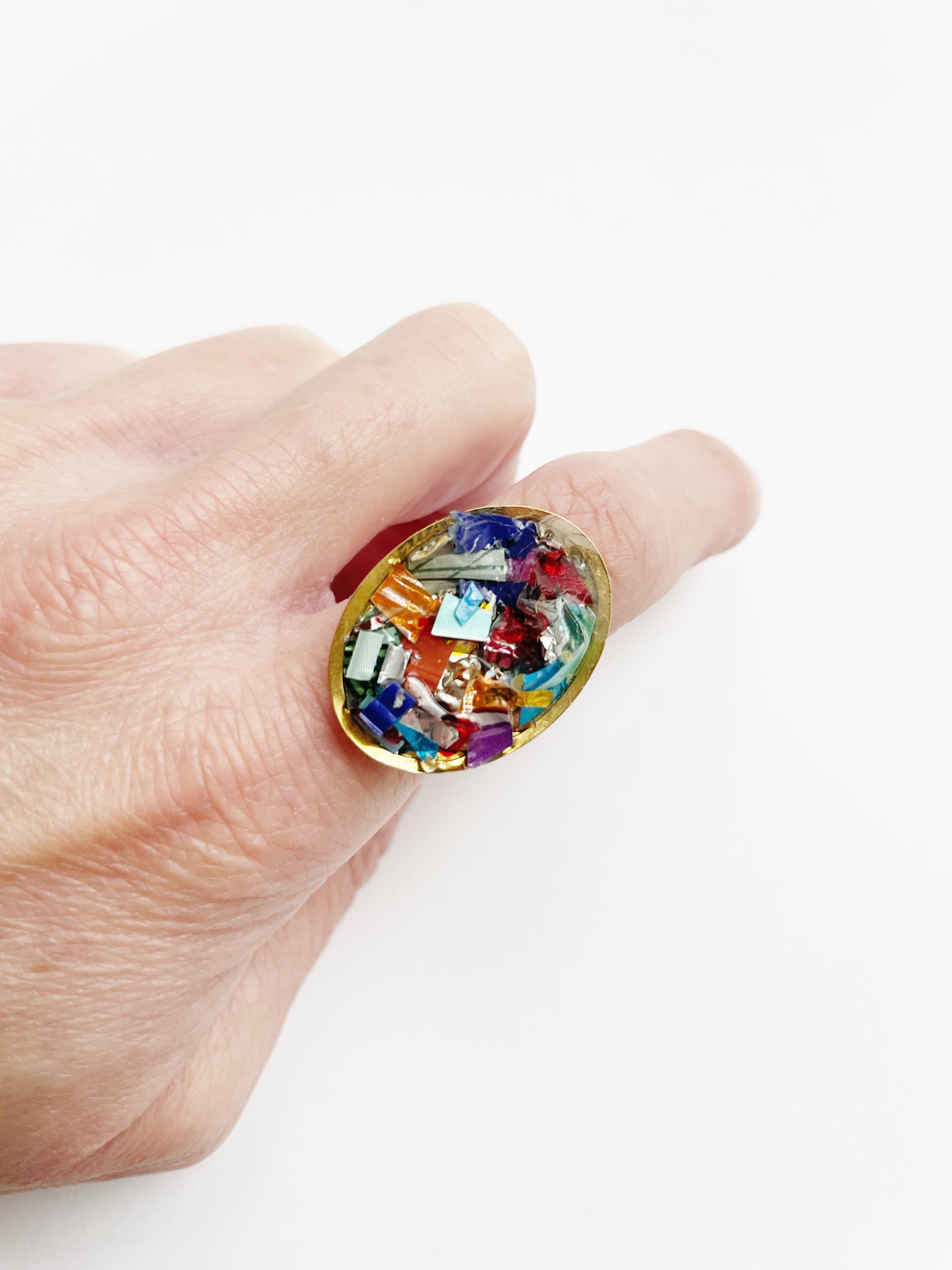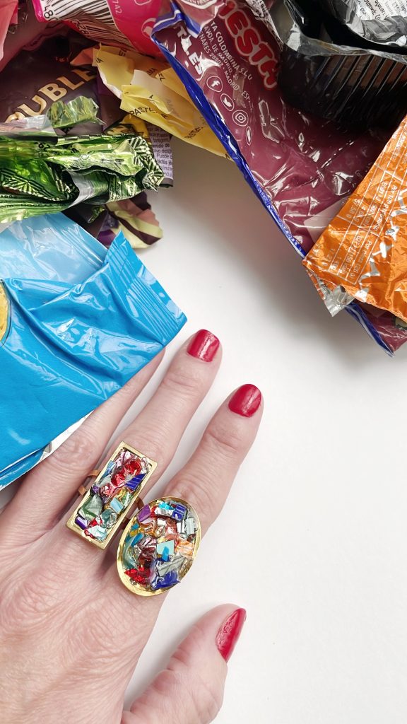 Toda la Colección Glastic está elaborada con envases y paquetes que desechamos diariamente y esta pieza no podía ser menos. Se trata de un anillo dorado con forma ovalada, de acero inoxidable, decorado con trozos pequeños de plástico clasificado, cortado, organizado y sellado con resina epoxi. Y sí, como lees, BASURA o como más me gusta decir, hecho con materiales RECICLADOS.