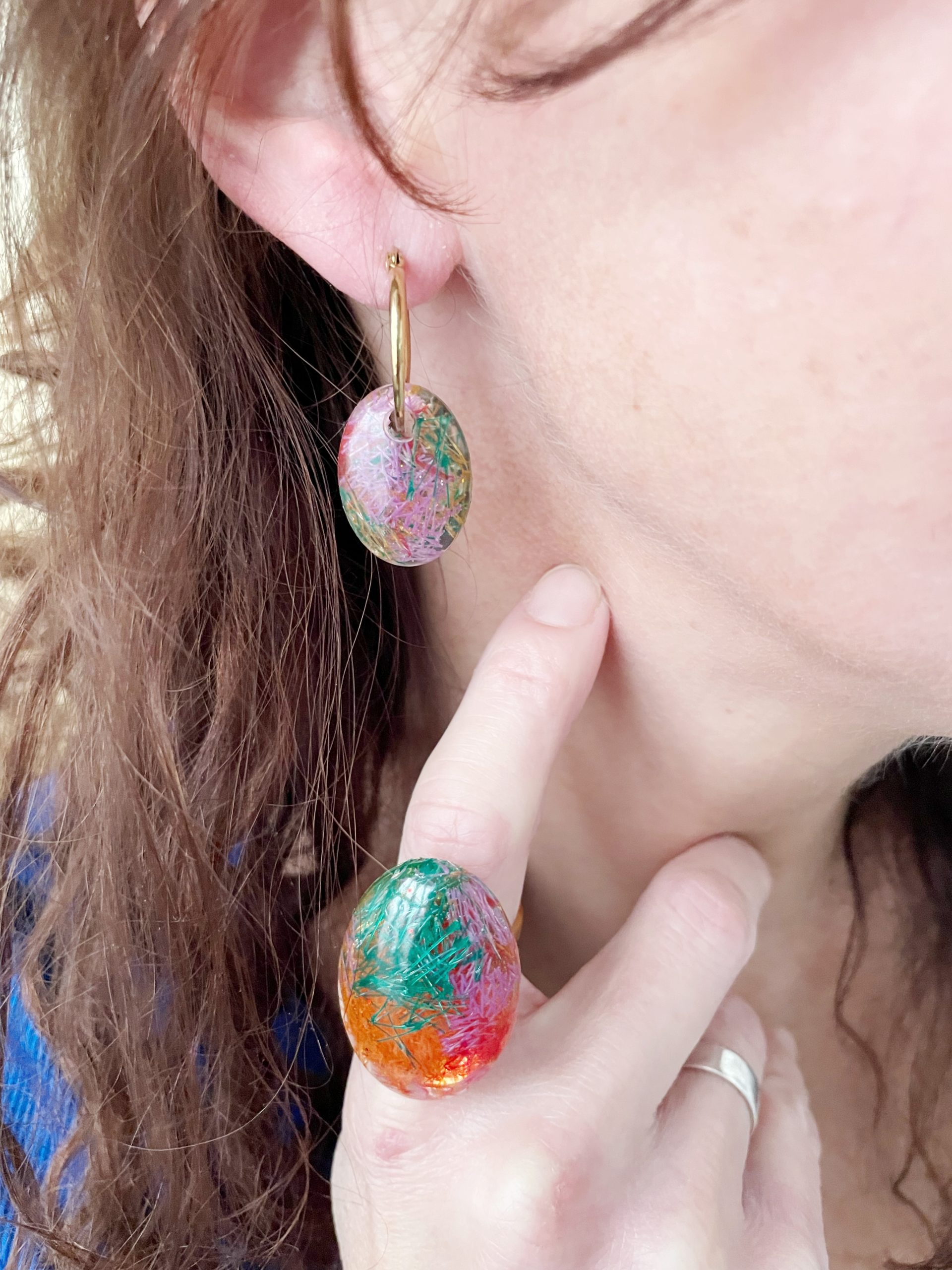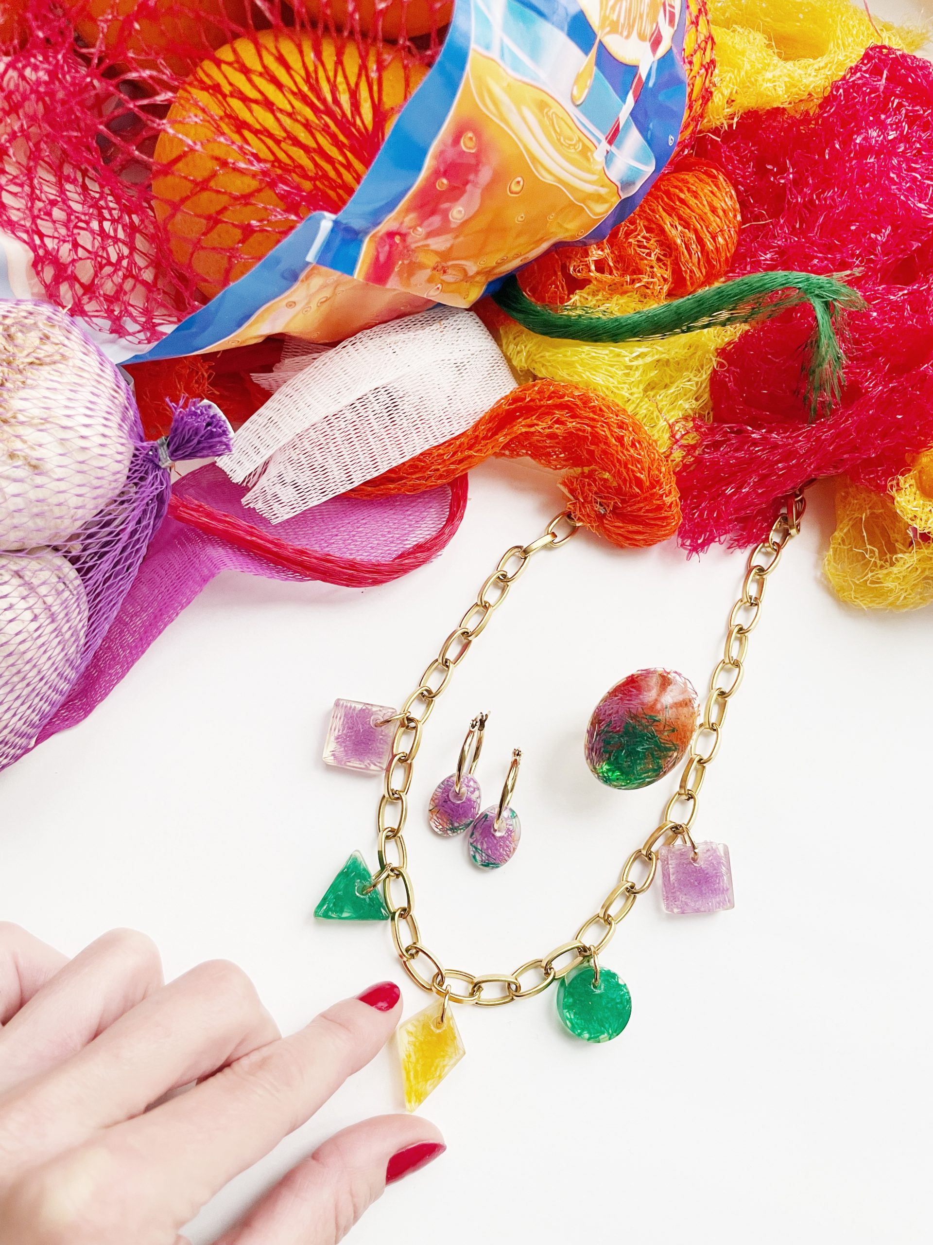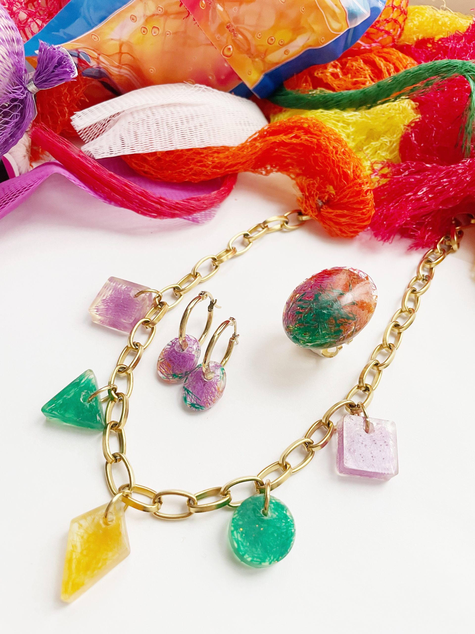 Toda la Colección Glastic está elaborada con envases y paquetes que desechamos diariamente y este Anillo Tricolor Malla no podía ser menos. Se trata de una pieza dorada con forma ovalada, de acero inoxidable, decorado con tres colores de mallas de ajos, cebollas y pimientos, entre otros alimentos y sellado con resina epoxi. Y sí, como lees, BASURA o como más me gusta decir, hecho con materiales RECICLADOS.