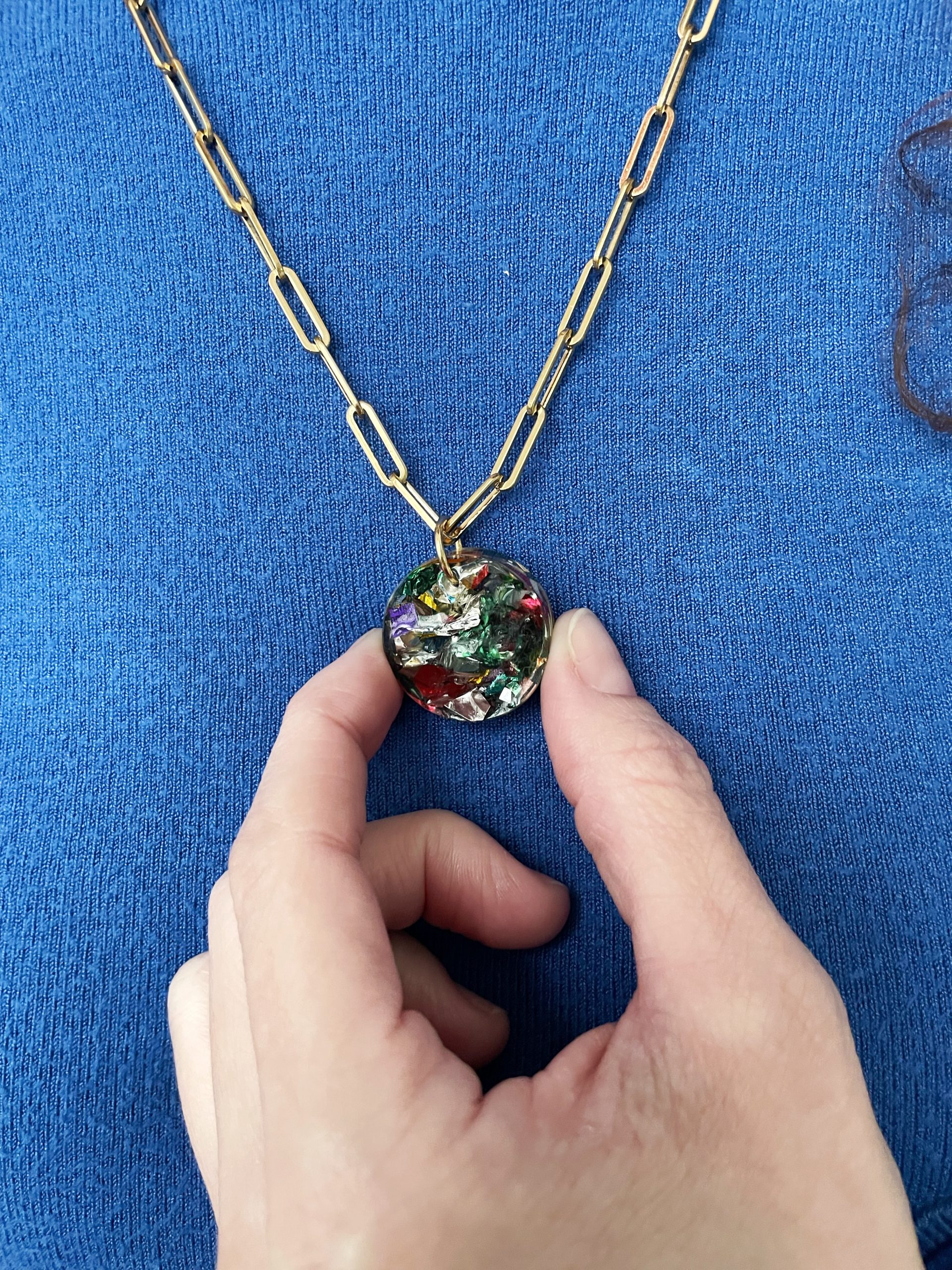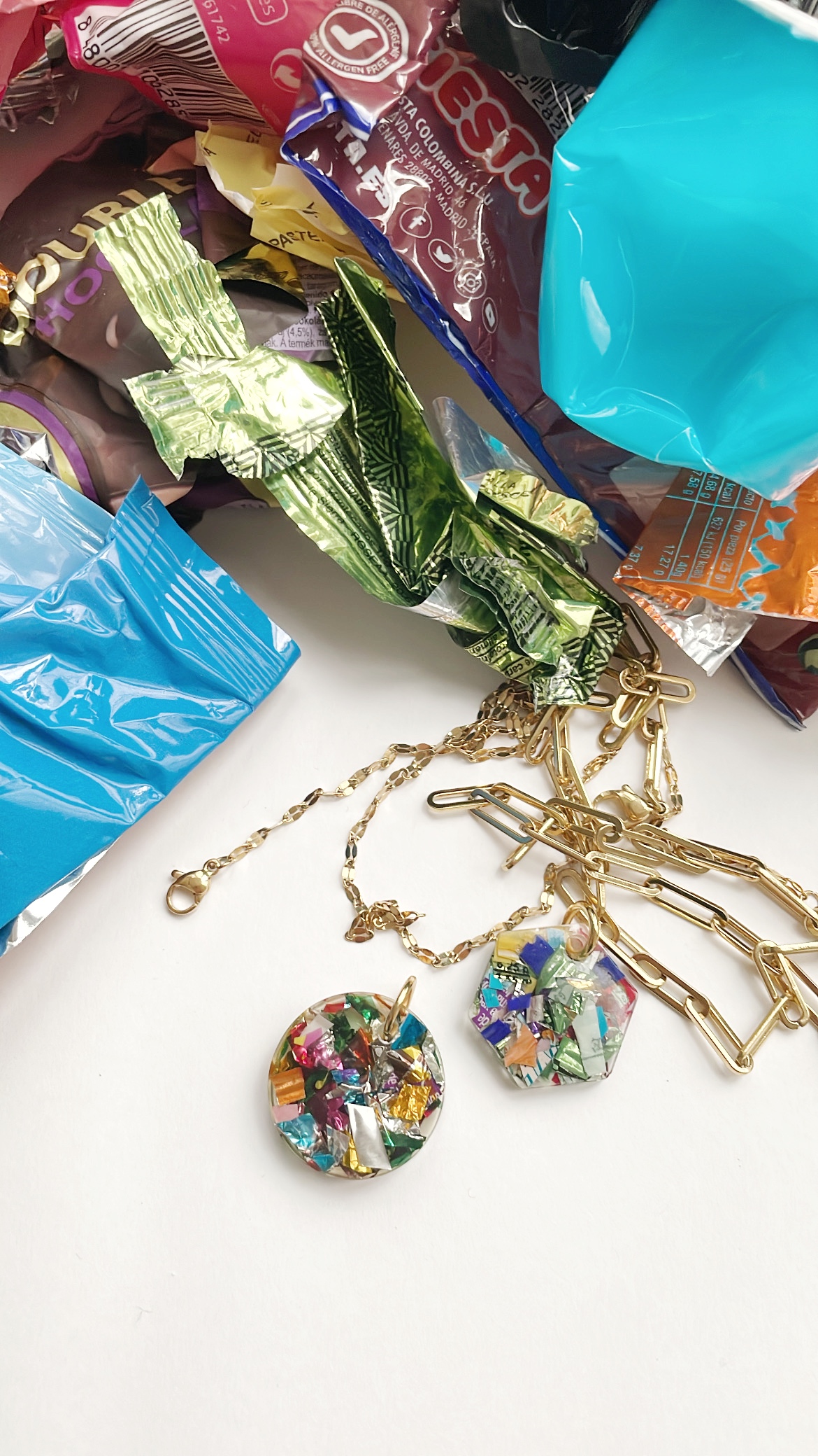 Toda la Colección Glastic está elaborada con envases y paquetes que desechamos diariamente y esta pieza no podía ser menos. Se trata de un colgante circular decorada con trozos pequeños de plástico clasificado, cortado, organizado y sellado con resina epoxi. La cadena es de acero inoxidable. Y sí, como lees, BASURA o como más me gusta decir, hecho con materiales RECICLADOS.