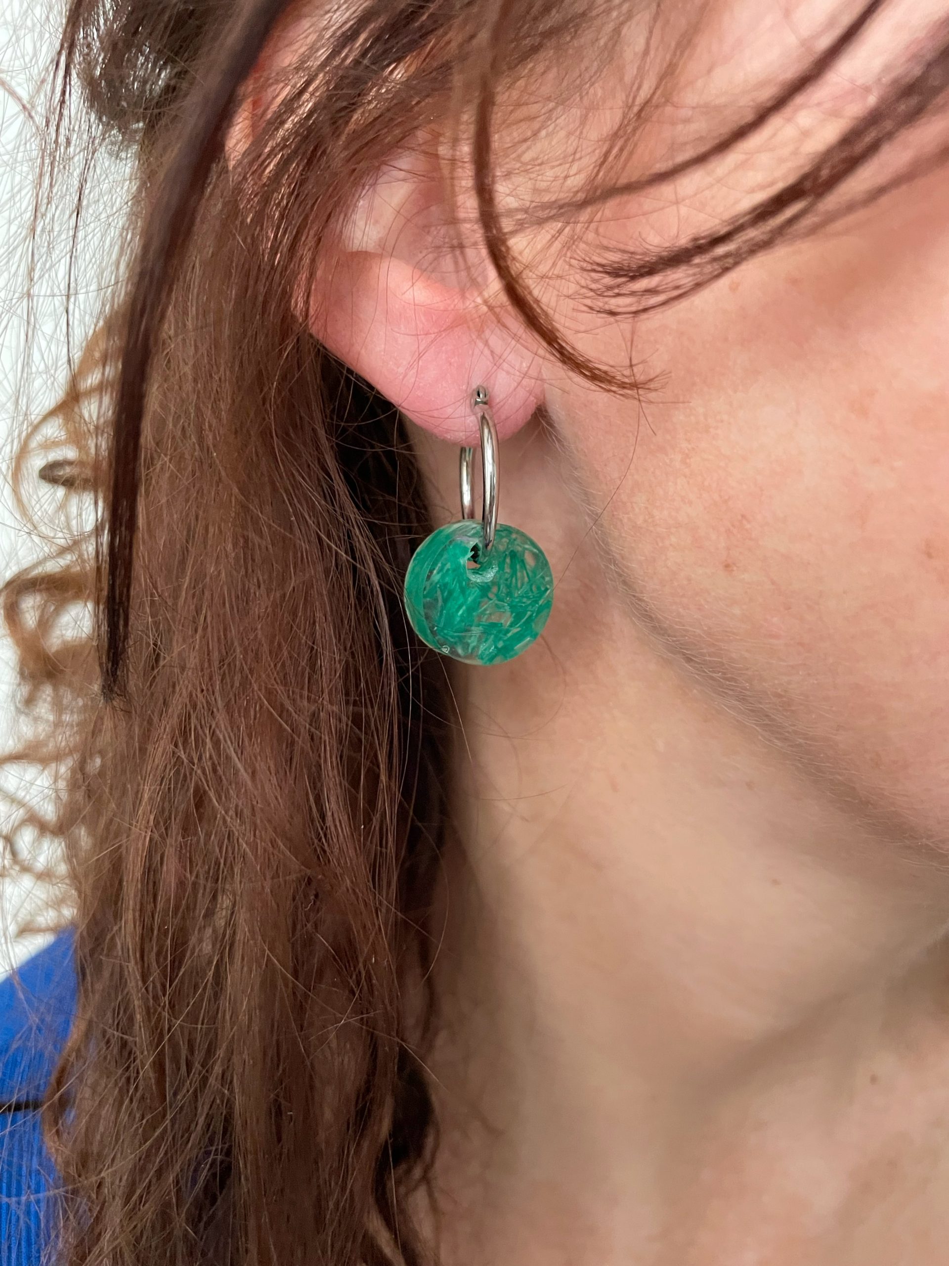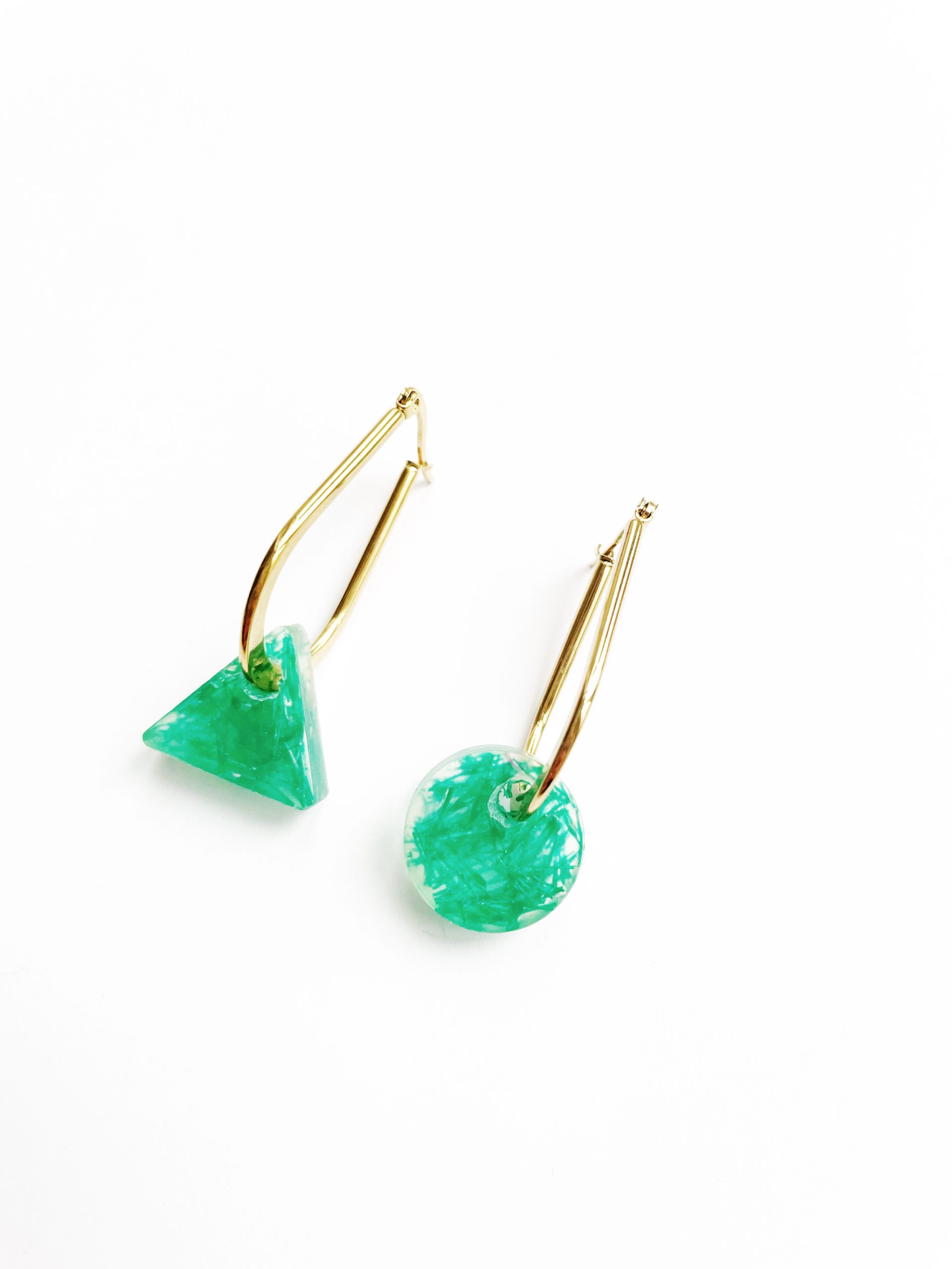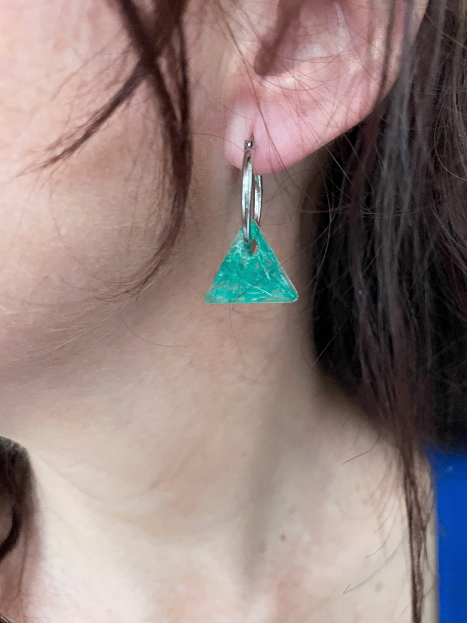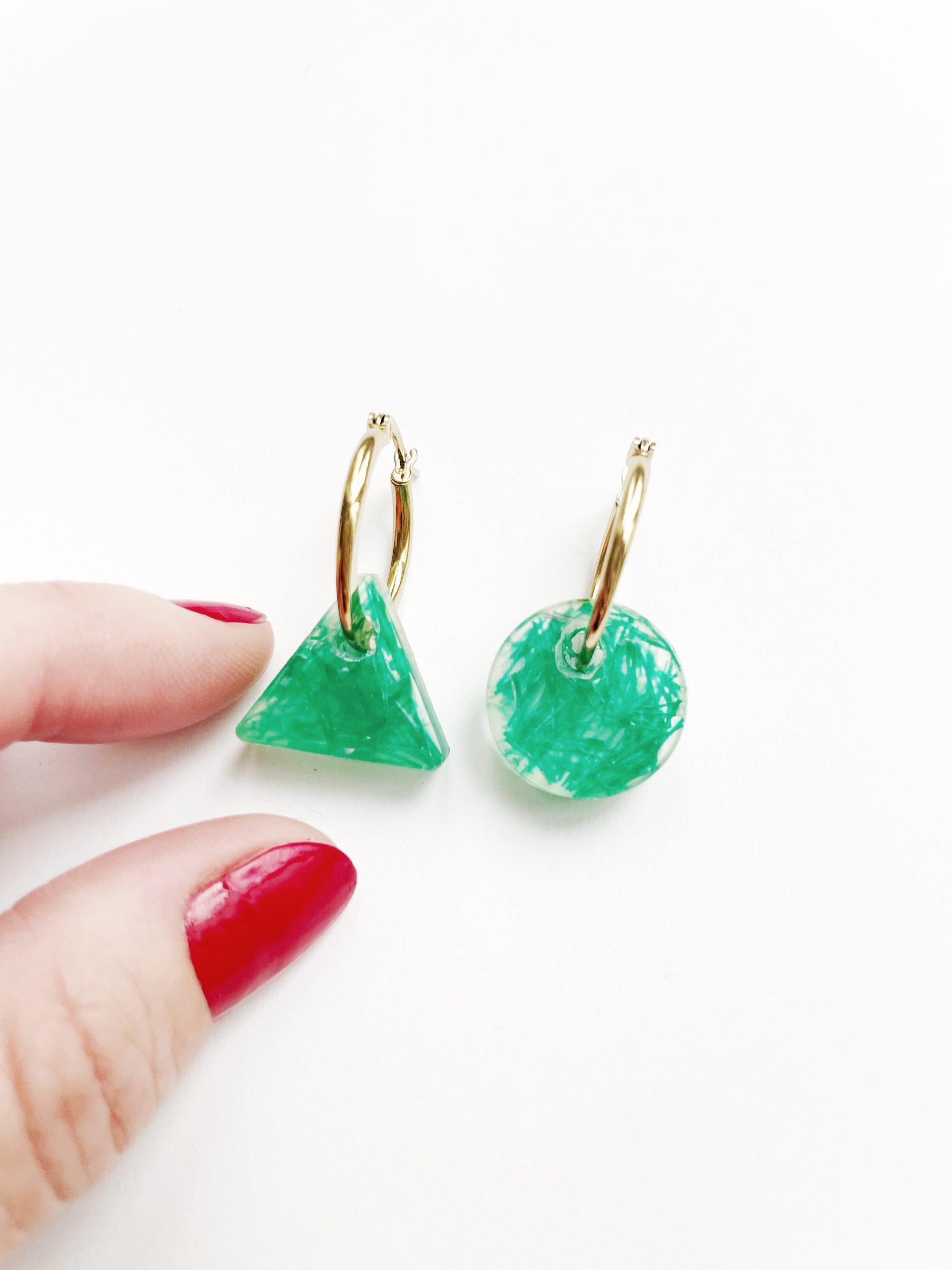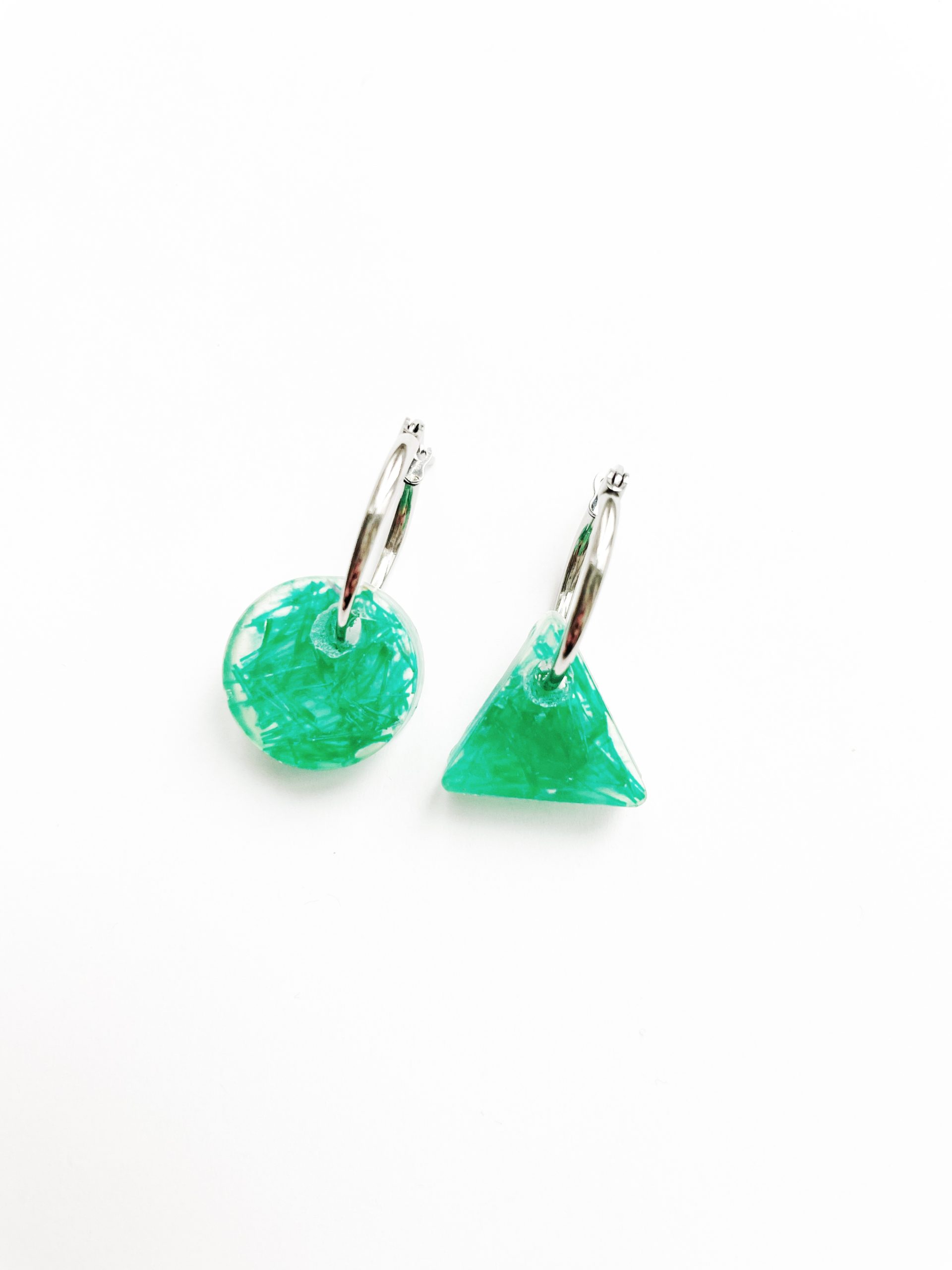 Toda la Colección Glastic está elaborada con envases y paquetes que desechamos diariamente y esta pieza no podía ser menos. Se trata de unos pendientes irregulares, una pieza redonda y otra triangular, con base de acero inoxidable, decorado con mallas de pimientos, sellado con resina epoxi. Y sí, como lees, BASURA o como más me gusta decir, hecho con materiales RECICLADOS.