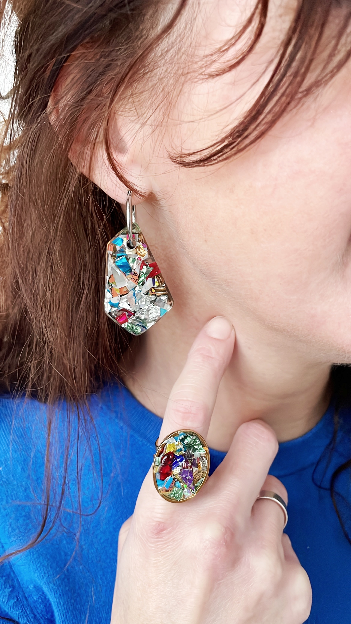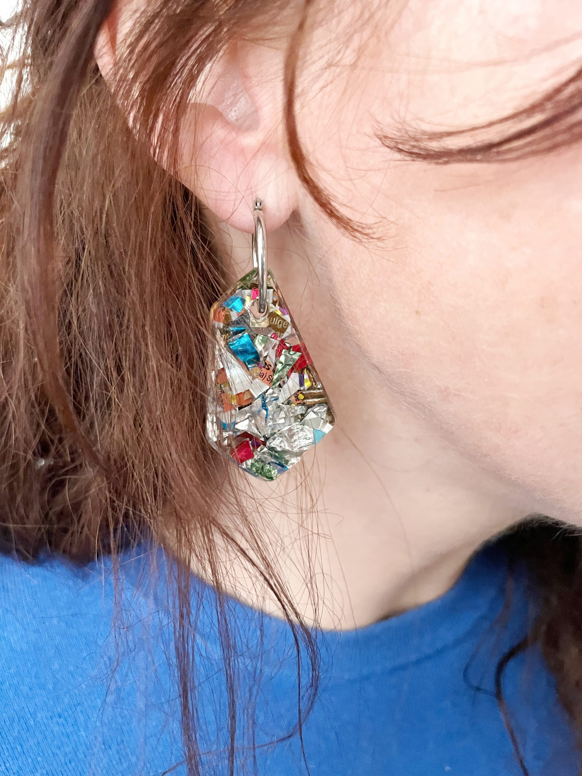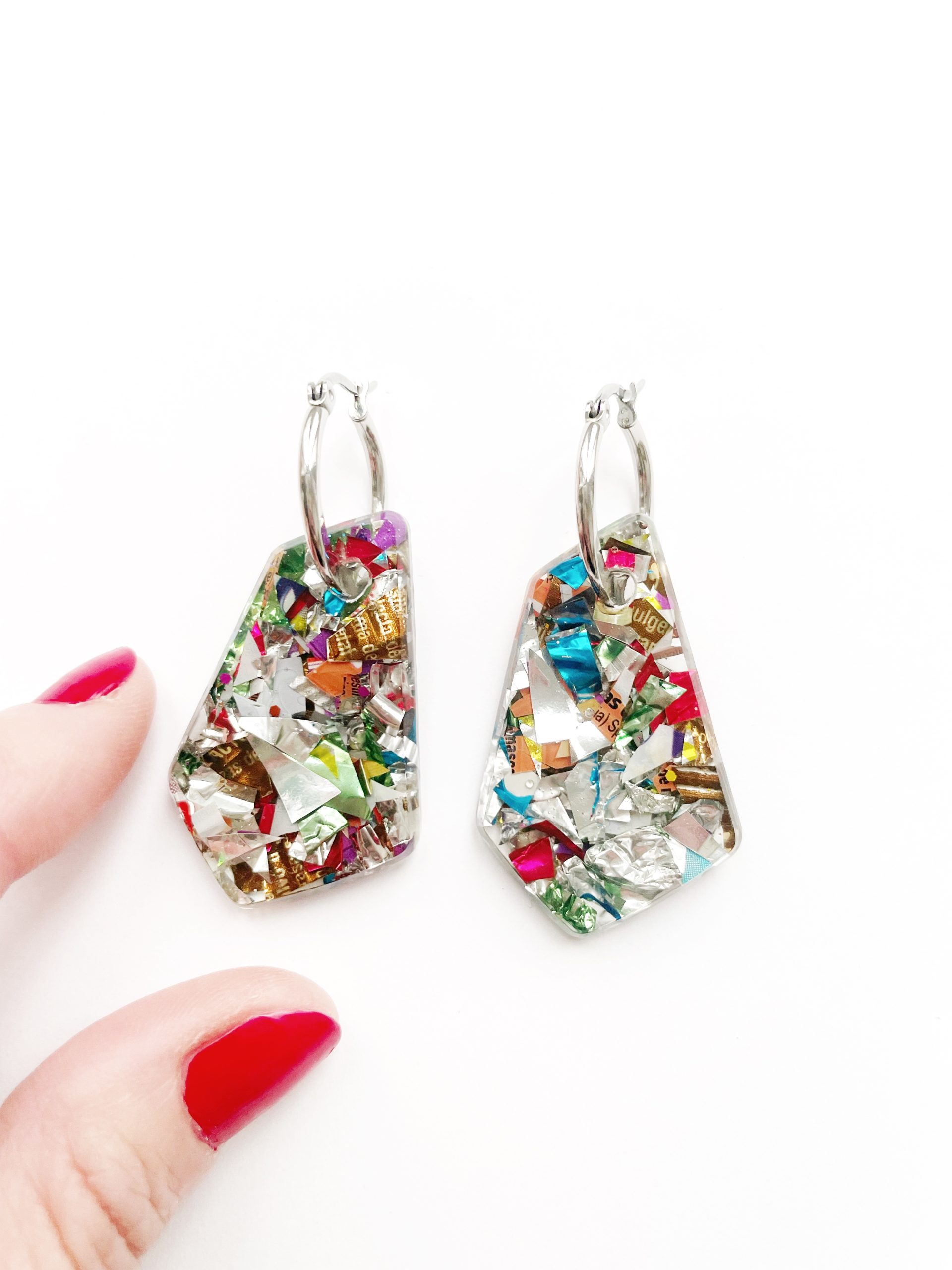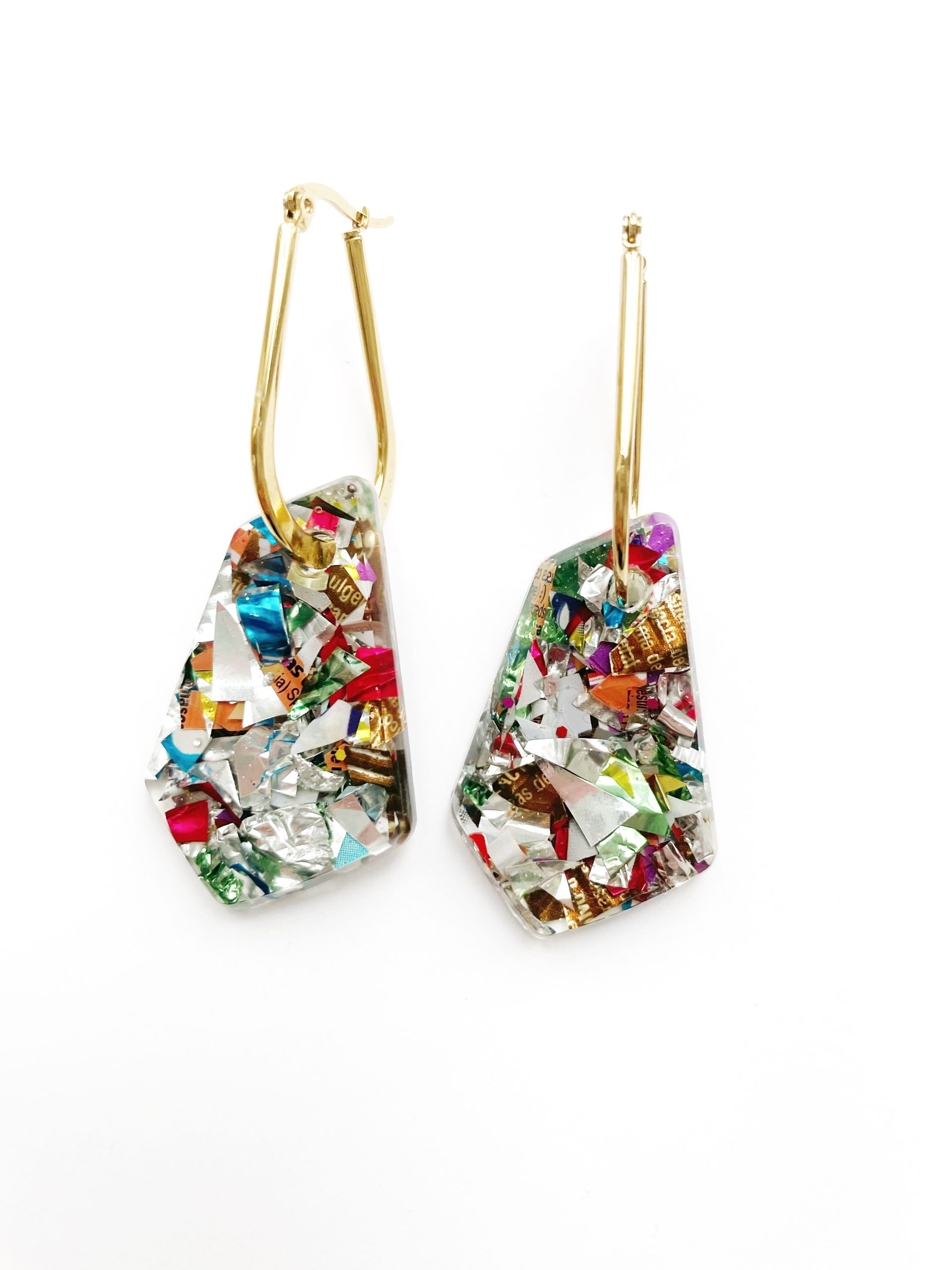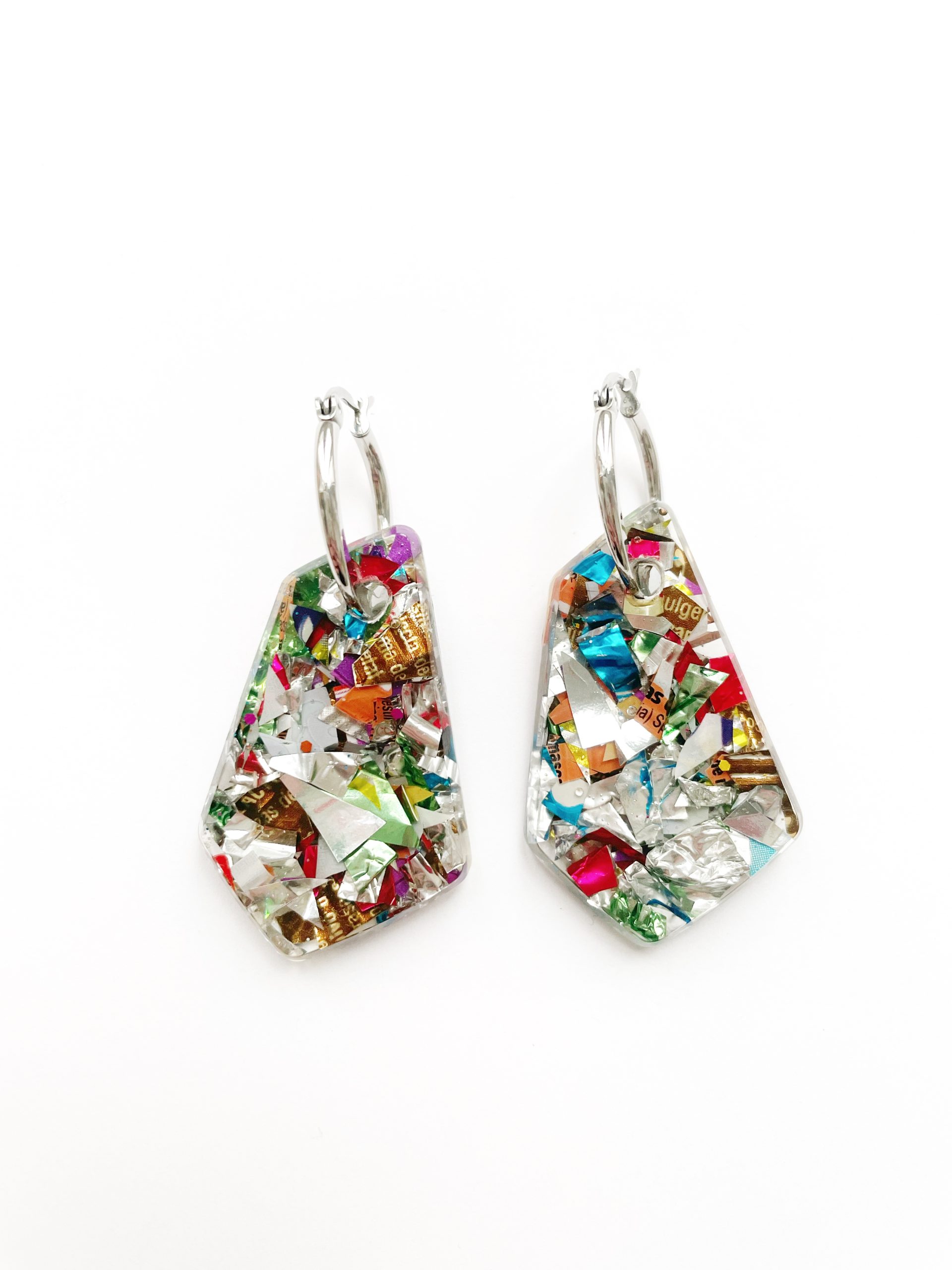 Toda la Colección Glastic está elaborada con envases y paquetes que desechamos diariamente y esta pieza no podía ser menos. Se trata de unos pendientes con forma de rombo irregular, de acero inoxidable, decorado con trozos pequeños de plástico clasificado, cortado, organizado y sellado con resina epoxi. Y sí, como lees, BASURA o como más me gusta decir, hecho con materiales RECICLADOS.
