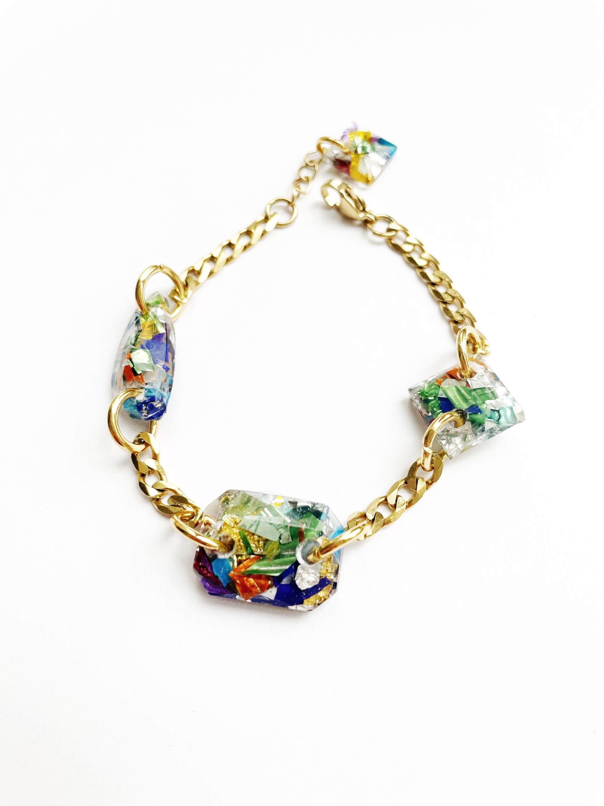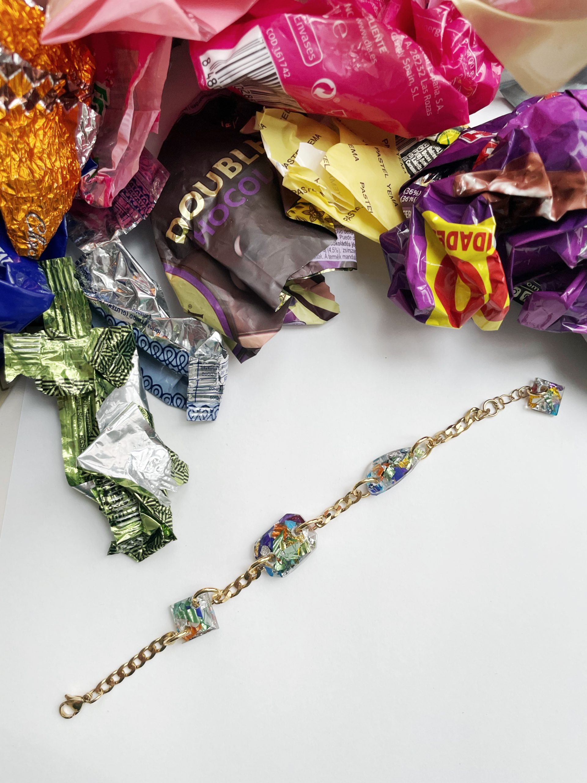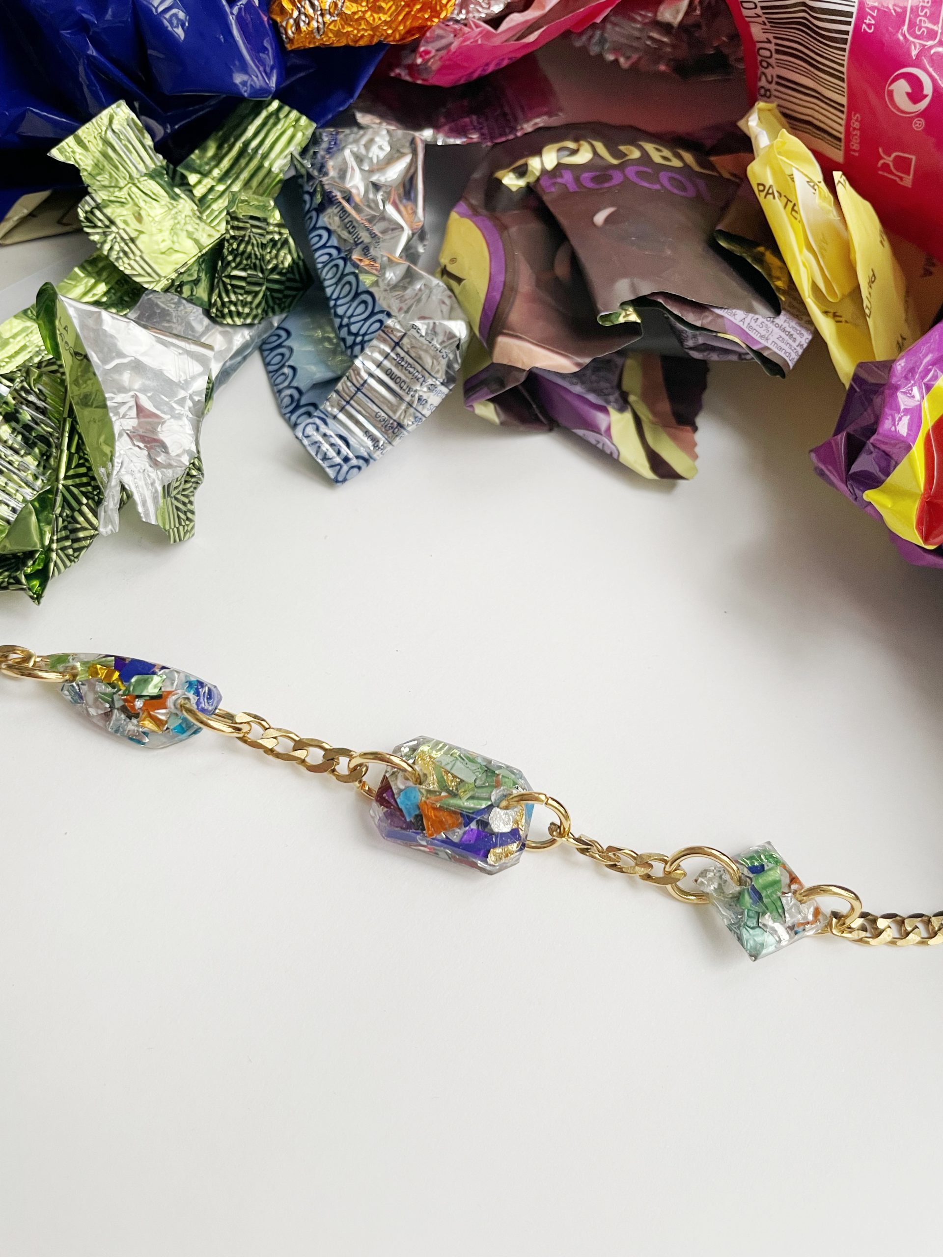 Toda la Colección Glastic está elaborada con envases y paquetes que desechamos diariamente y esta pieza no podía ser menos. Se trata de una pulsera que lleva tres piezas y una de colgante a modo de adorno, de acero inoxidable, decorada con trozos pequeños de plástico clasificado, cortado, organizado y sellado con resina epoxi. Y sí, como lees, BASURA o como más me gusta decir, hecho con materiales RECICLADOS.