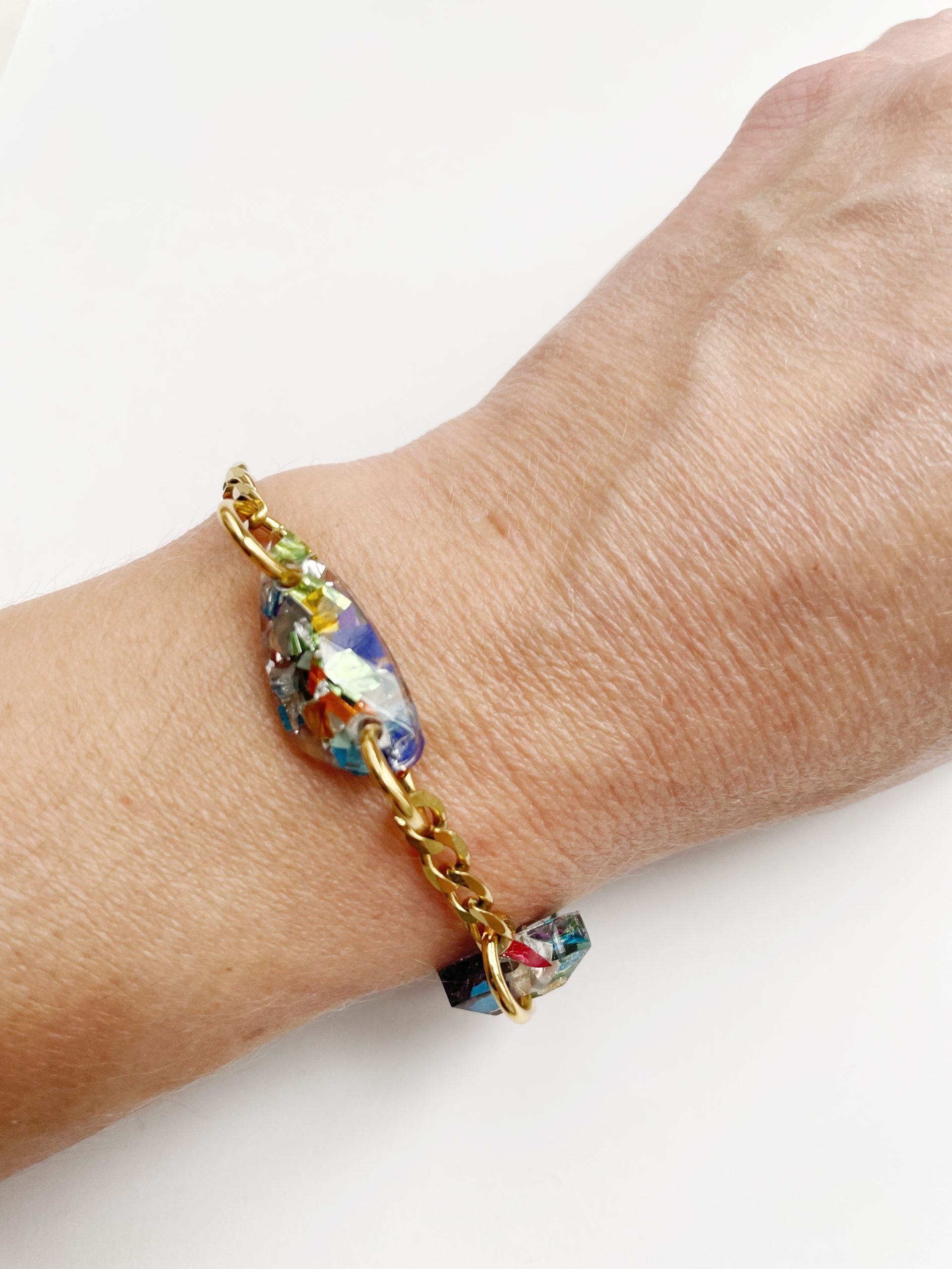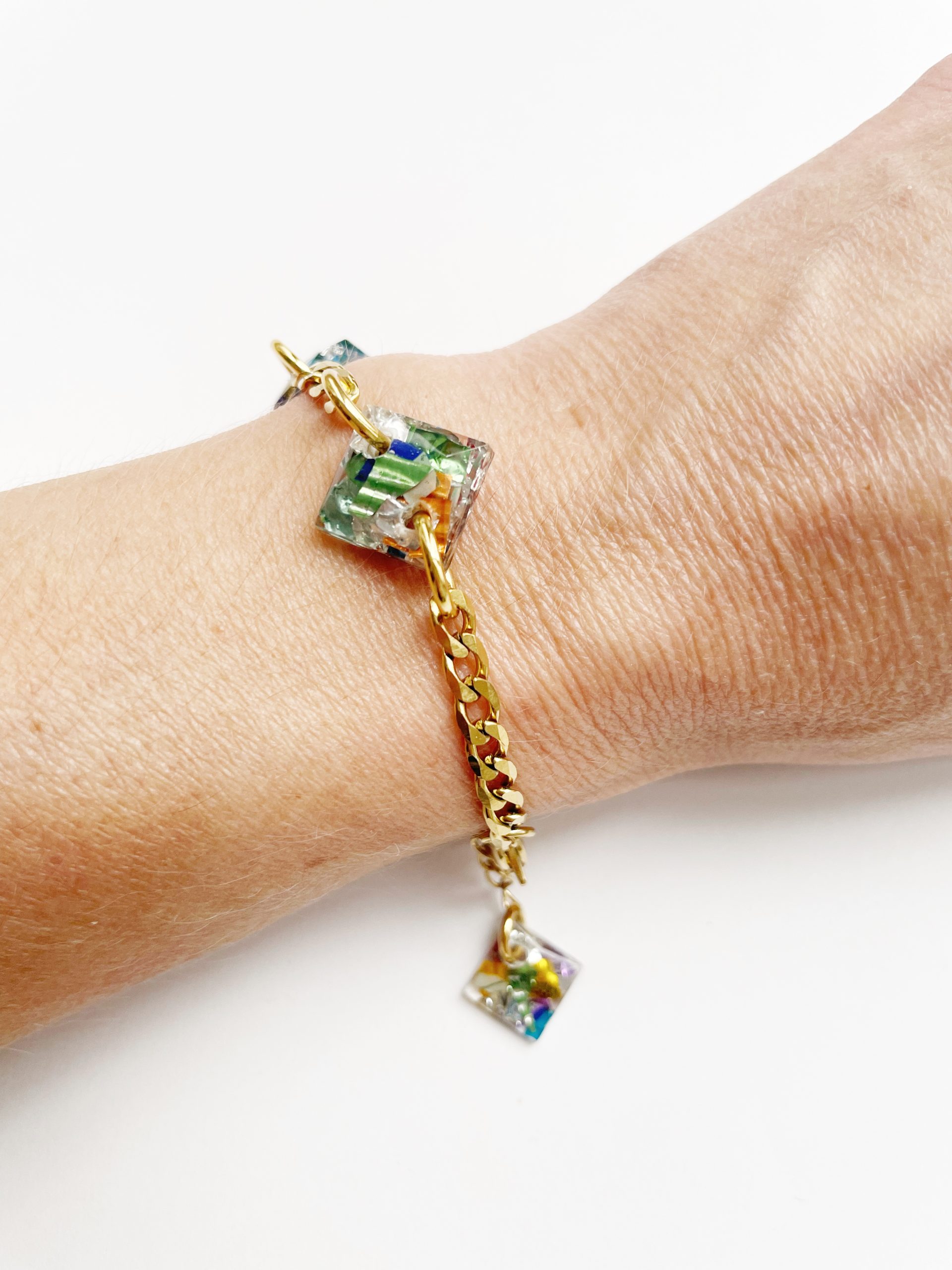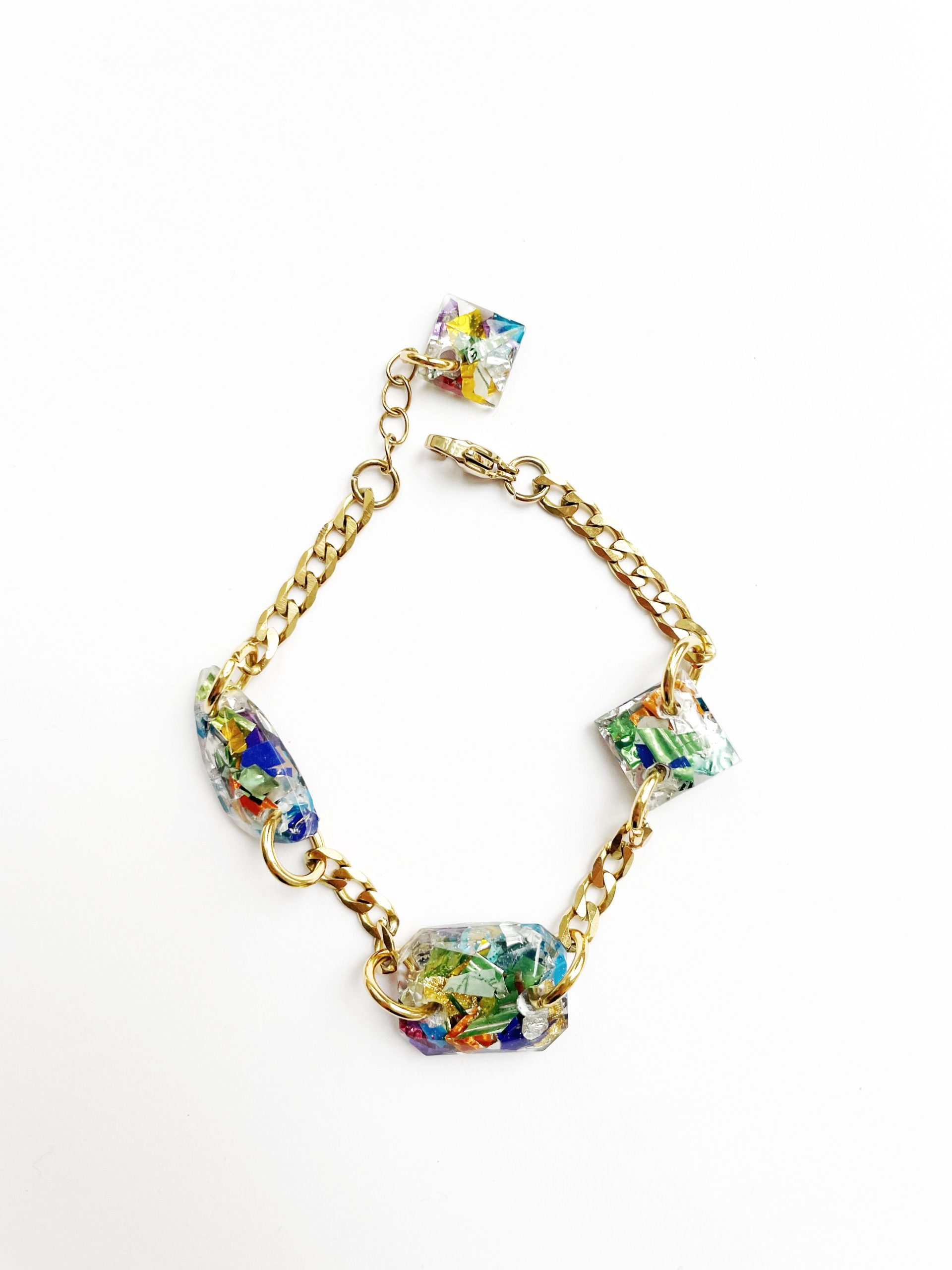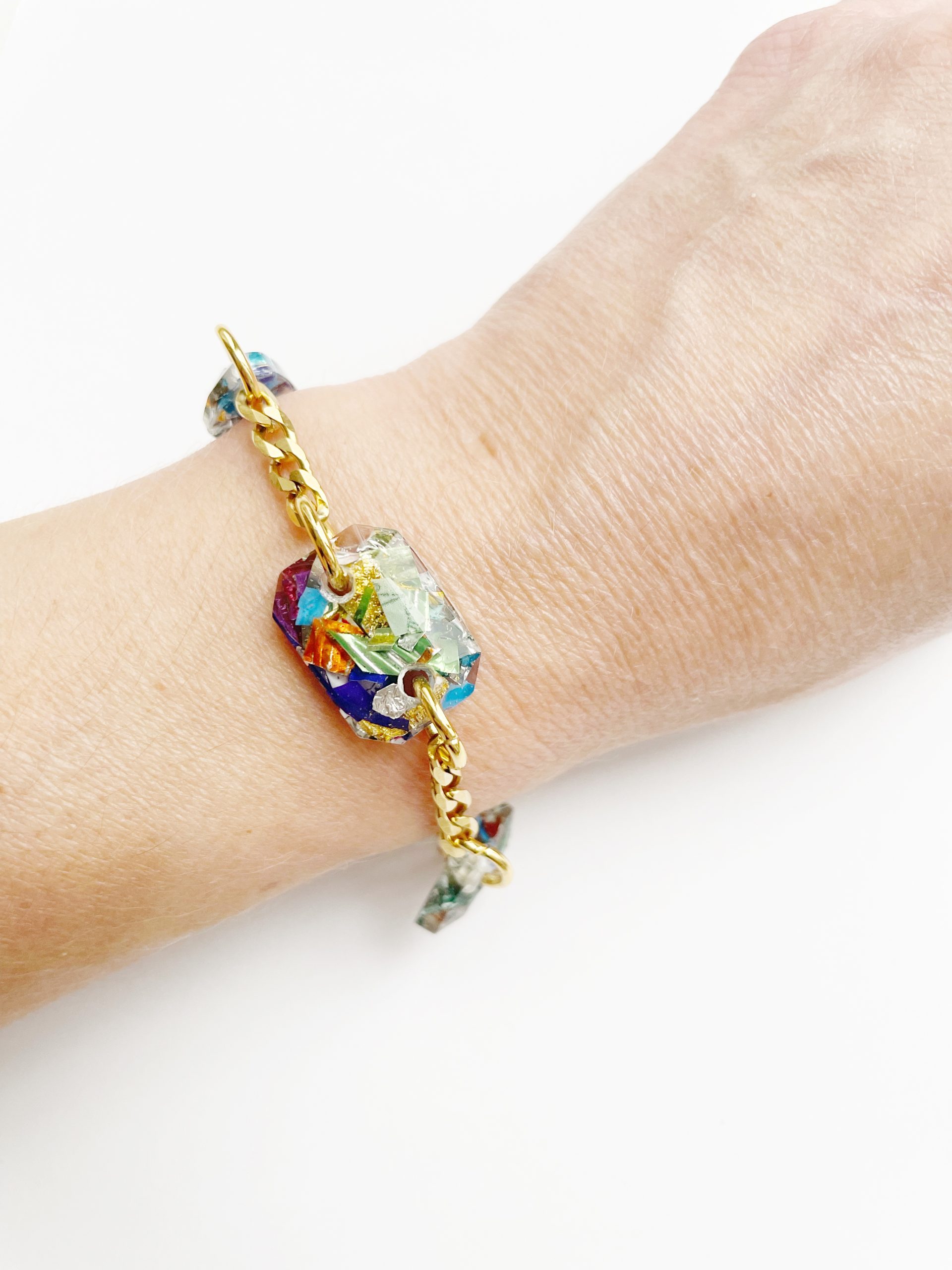 Toda la Colección Glastic está elaborada con envases y paquetes que desechamos diariamente y esta pieza no podía ser menos. Se trata de una pulsera que lleva tres piezas y una de colgante a modo de adorno, de acero inoxidable, decorada con trozos pequeños de plástico clasificado, cortado, organizado y sellado con resina epoxi. Y sí, como lees, BASURA o como más me gusta decir, hecho con materiales RECICLADOS.